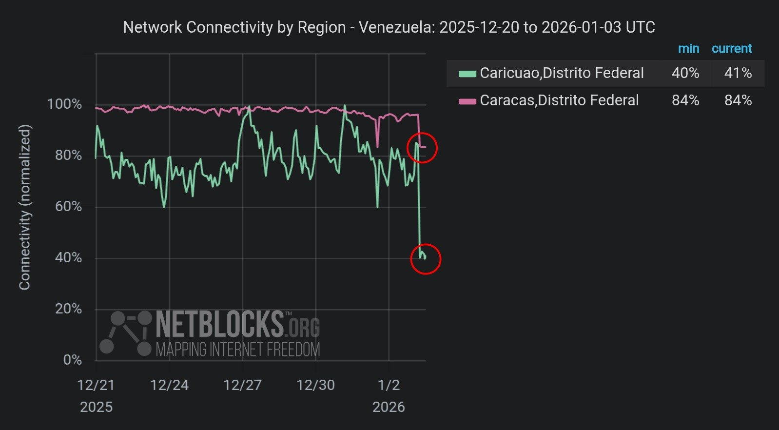 Netblock was one of the first to report on the loss of internet connectivity in Caracas, aligning with the power cuts observed in the country.